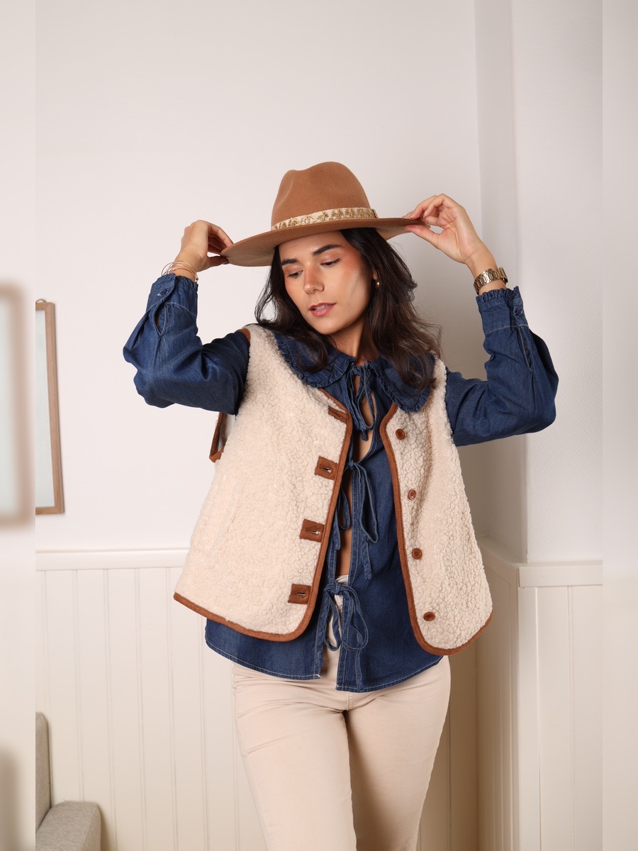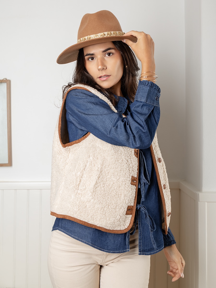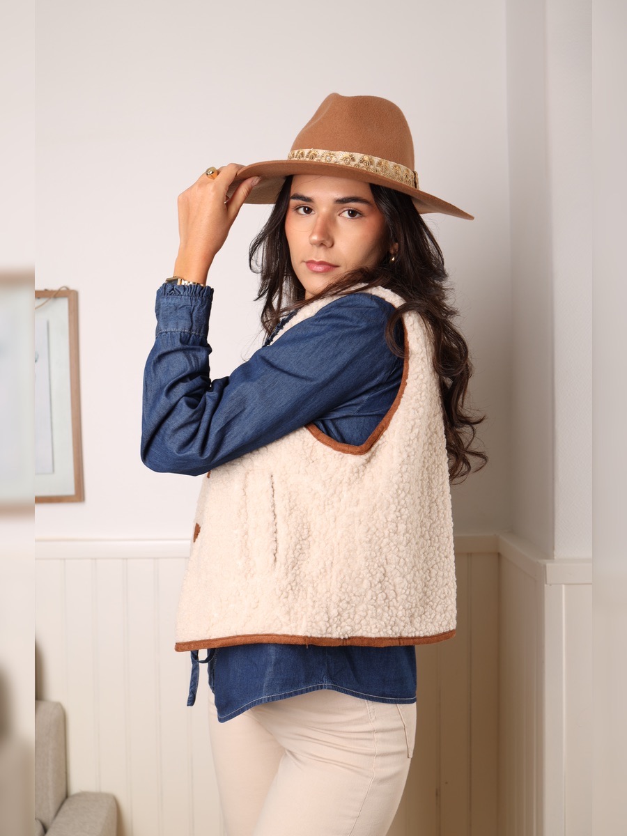 Ce gilet sans manches, confectionné dans une matière douce et duveteuse effet mouton, est la pièce idéale pour ajouter une touche chaleureuse et tendance à n’importe quelle tenue.